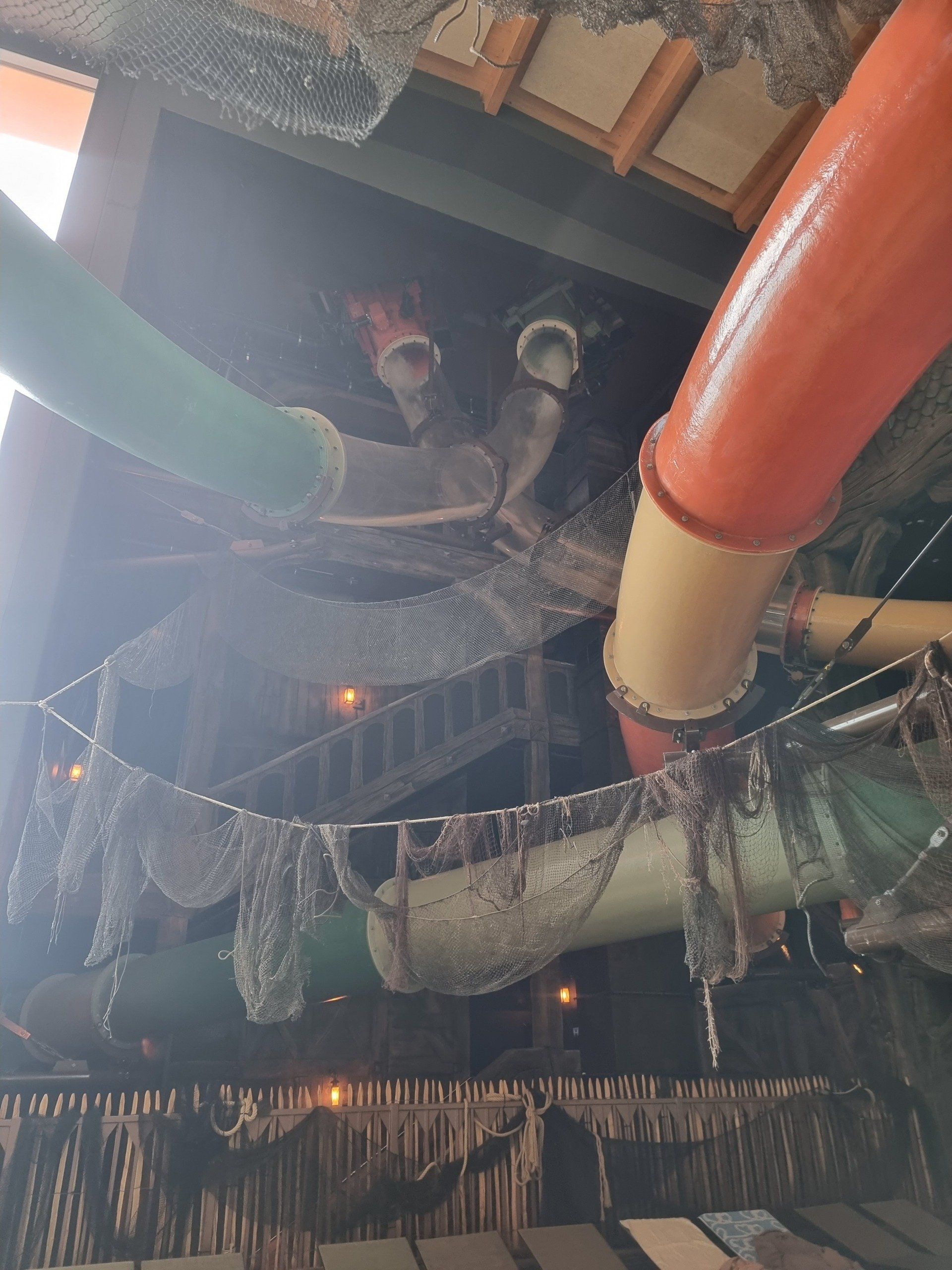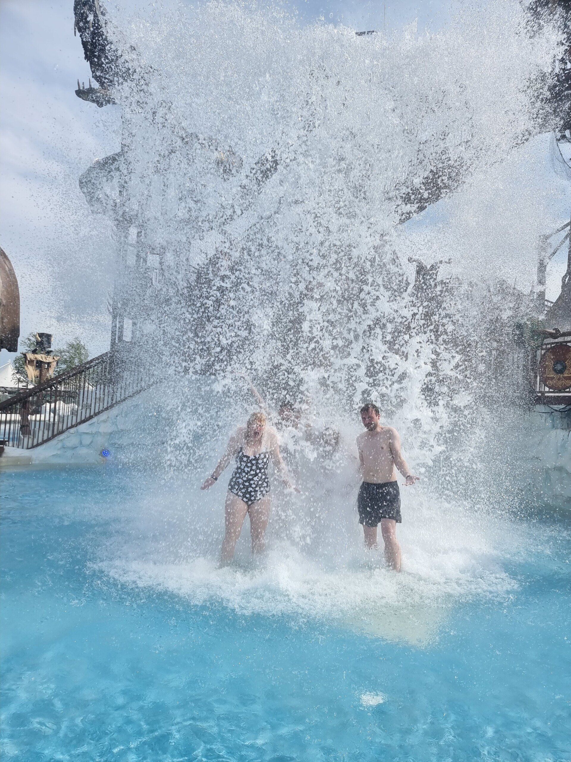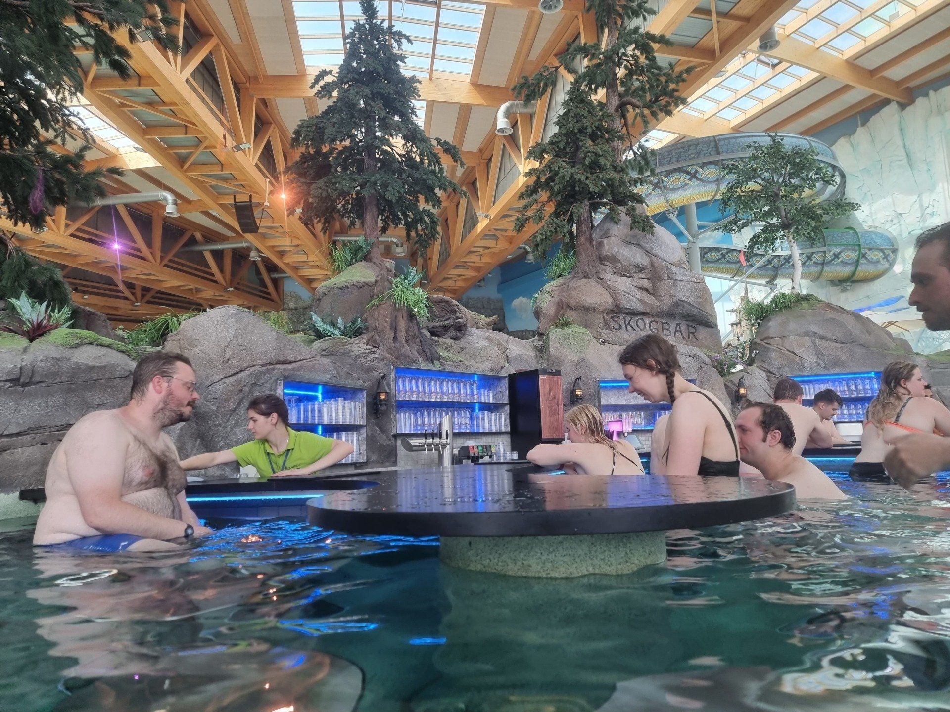 Draußen gab es nicht nur ein Außenbecken mit Bar, sondern auch einen riesigen Wasserspielplatz. Das Wetter strahlte mit 28 Grad und es war einfach nur perfekt. Vor allem, wenn man noch so schön Kind im Kopf ist und jeden Wasserbehälter auf andere Gäste auskippen muss. Gegen 19:00 Uhr legte noch ein DJ draußen auf, nachdem wir unser Abendessen eingenommen hatten. Die anderen wählten Pizza und Pasta, für mich gab es Salat mit Garnelen, wir wollen ja mal auf dem Boden bleiben. Rulantica hat bis 22:00 Uhr geöffnet. Nach unserem 3. Cocktail im Blubberbecken, wo ich mich todesmutig auf den großen Blubberhaufen stürzte, entschieden wir jedoch schon gegen 21:00 Uhr die Reise zum Apartment anzutreten. Da unsere Freunde aus Holland direkt zum Wasserpark kamen, nahmen wir sie auf der Rückfahrt mit. Wozu hat man denn so ein großen Auto? Nun saßen wir zu 6. in unserem hübschen Zimmer, pumpten fleißig die Luftmatratze für mich auf (denn sie hatten das Zimmer zu 5. gebucht, bevor ich mich angehangen hatte) und quatschten noch ein wenig bevor wir tief und fest einschliefen. Immerhin wartete am nächsten Tag ja ein noch viel anstrengenderer Tag auf uns.