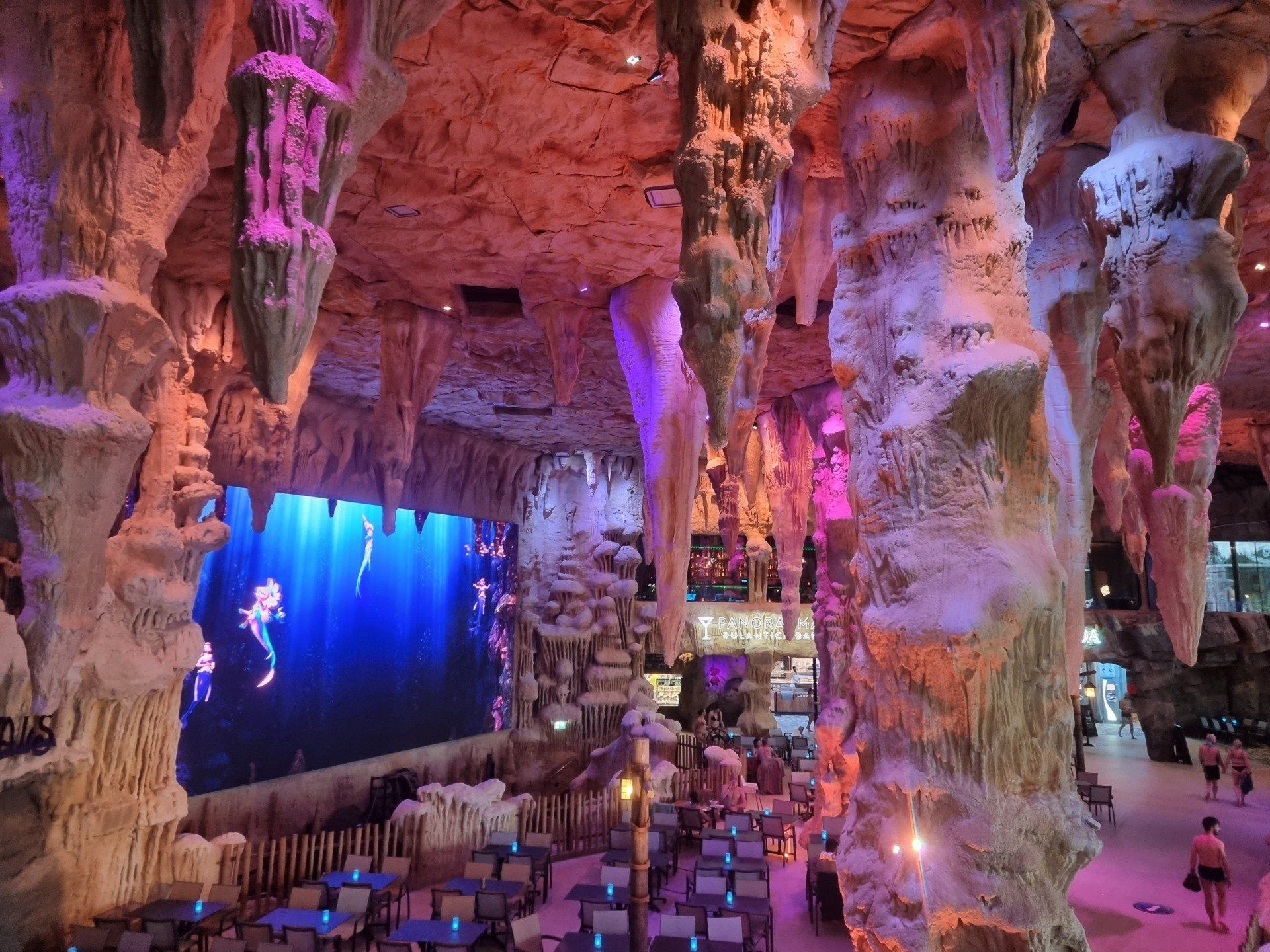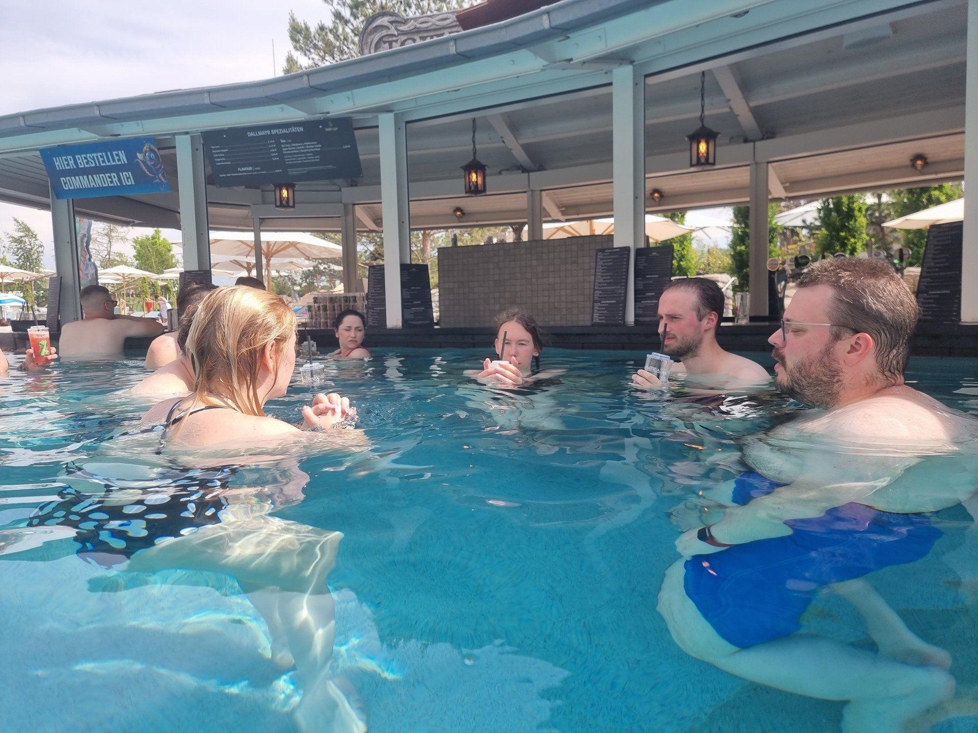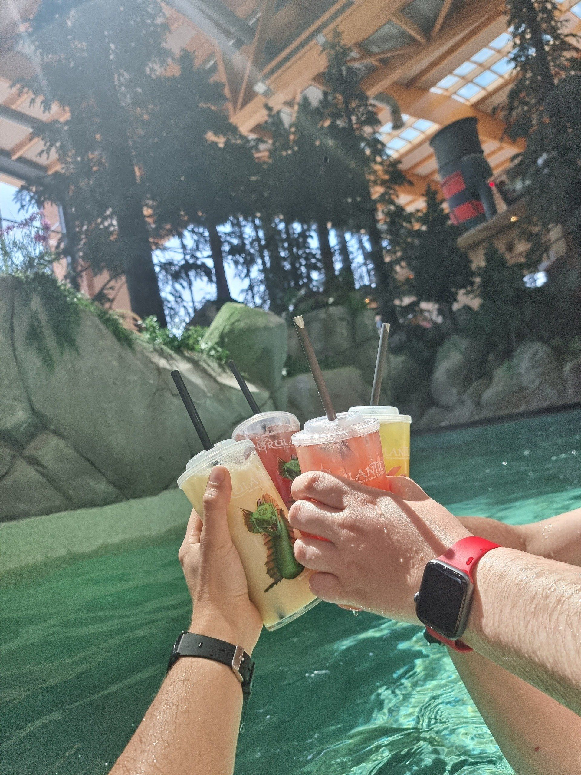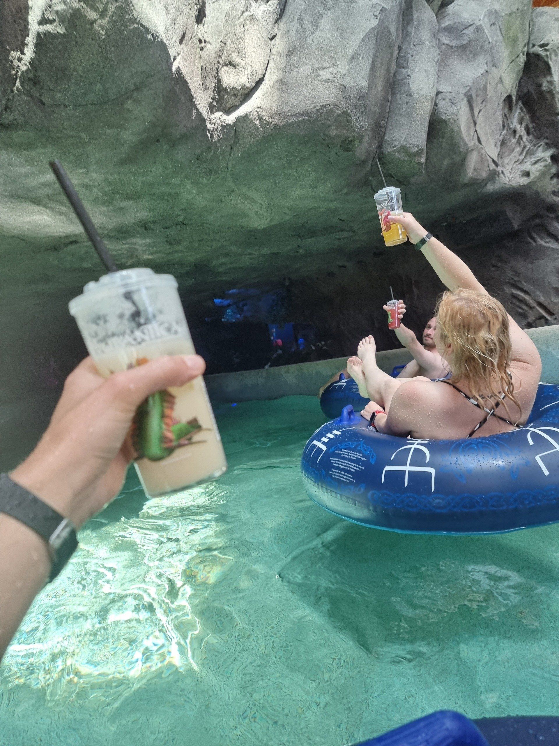 Nun wurde es aber auch Zeit für den ersten Cocktail, denn haltet euch fest: Es gibt Swim-Up-Bars! Ja, man kann seine Cocktails im Wasser trinken und nicht nur das, die schwimmenden Becher kann man überall mit hinnehmen. Ins Außenbecken und sogar auf die "Reifenfahrt". Das ist so typisch Europapackmäßig eine Tour mit einem Reifen durch Höhlen etc. Zwar steht dort, dass Speisen, Handys und Getränke nicht erlaubt sind, nach unserem freundlichen Fragen durften wir die Cocktails jedoch mitnehmen. Mein bester Freund an diesem Tag hieß: Pina Colada. Und mein Handy hatte ich natürlich auch dabei, zum ersten Mal mutig in einer Wasserschutzhülle. Das hatte ich schon für Ägypten öfters überlegt, mich jedoch nie getraut. An diesem Tag brauchte ich mein Handy aber, um meinen Zucker zu überwachen. Ganz klar, dass wir somit auch viele Fotos gemacht haben.