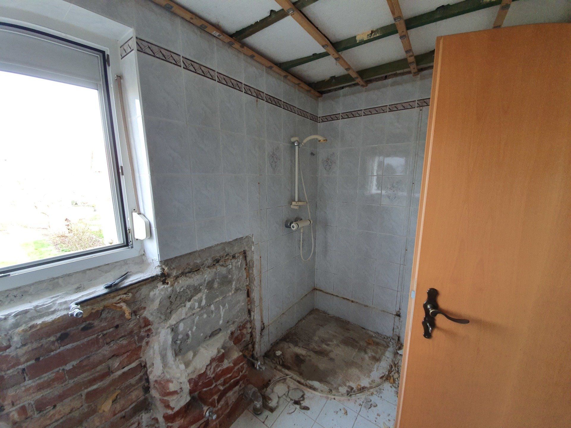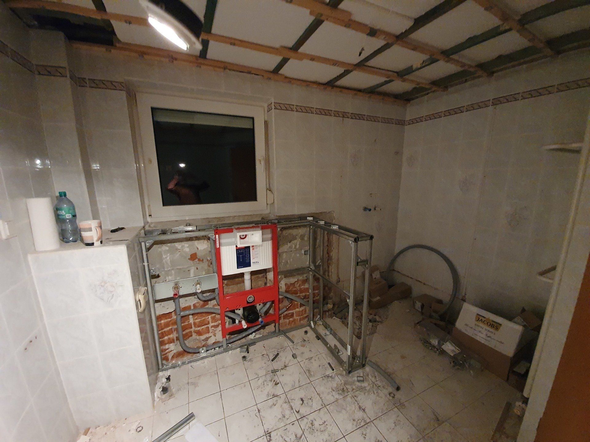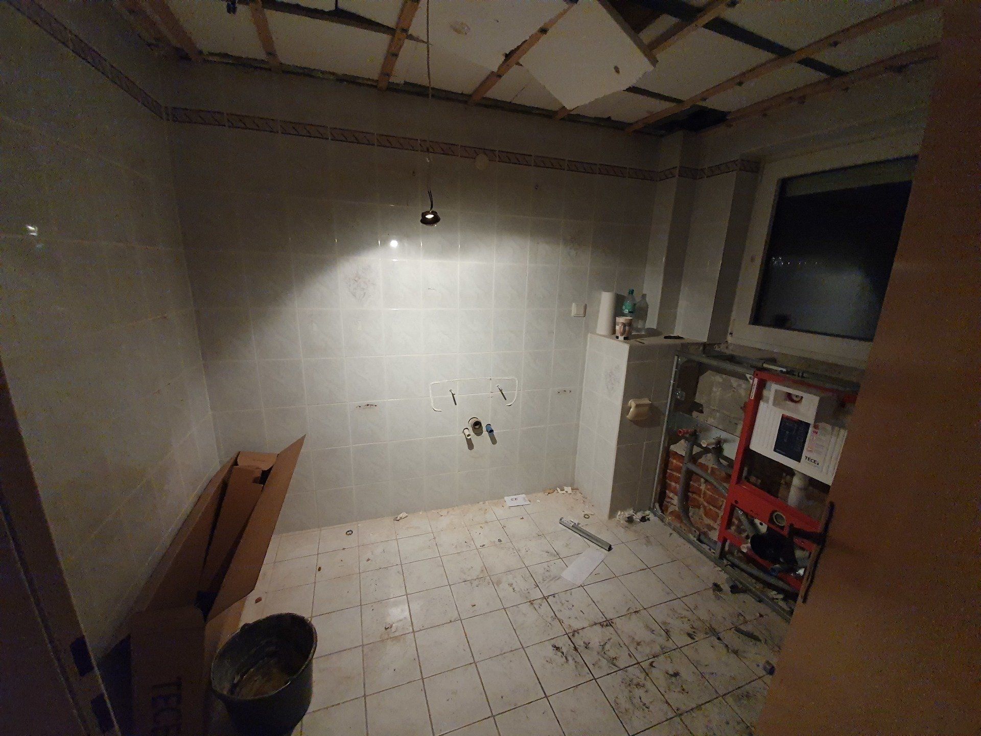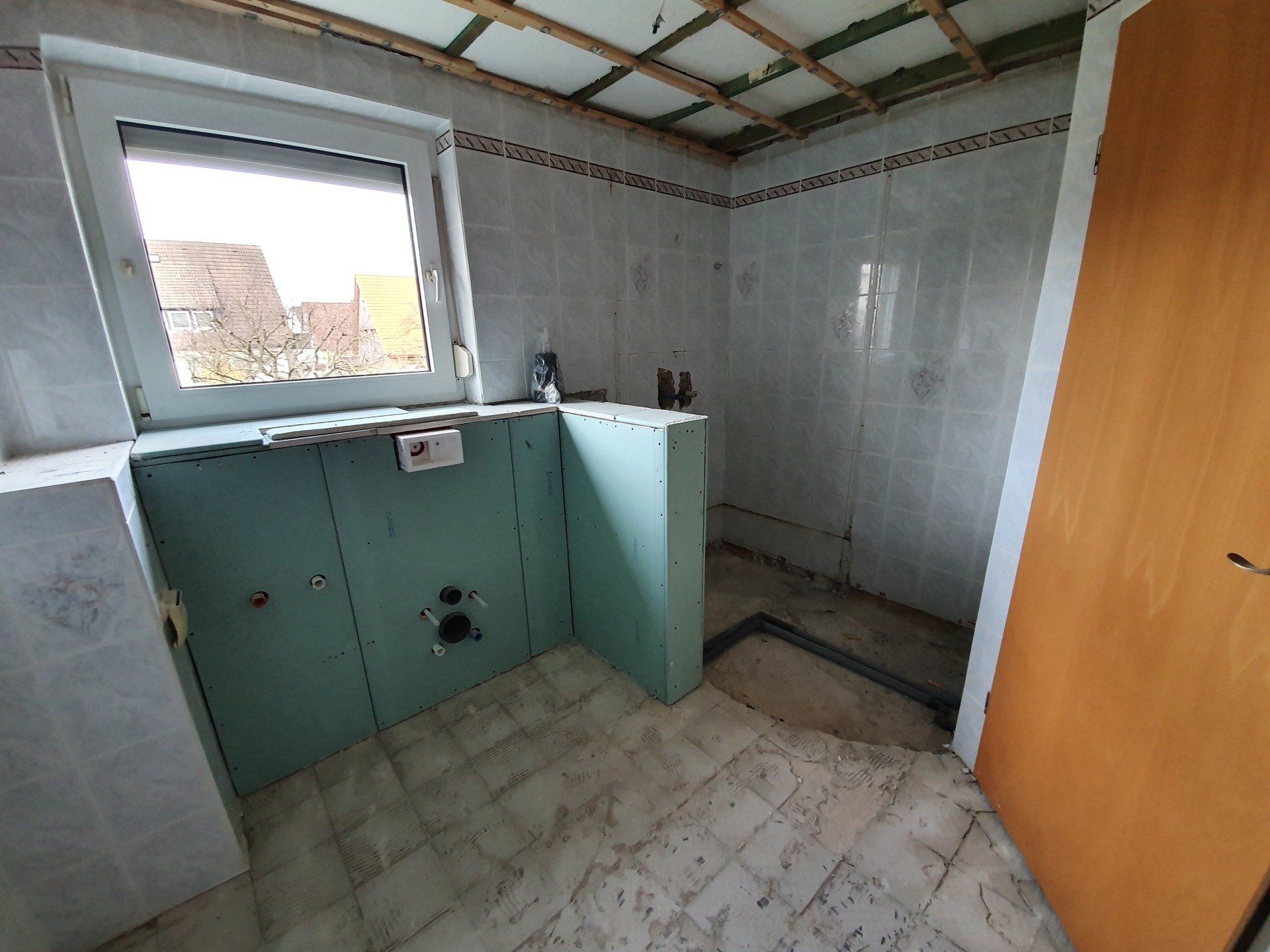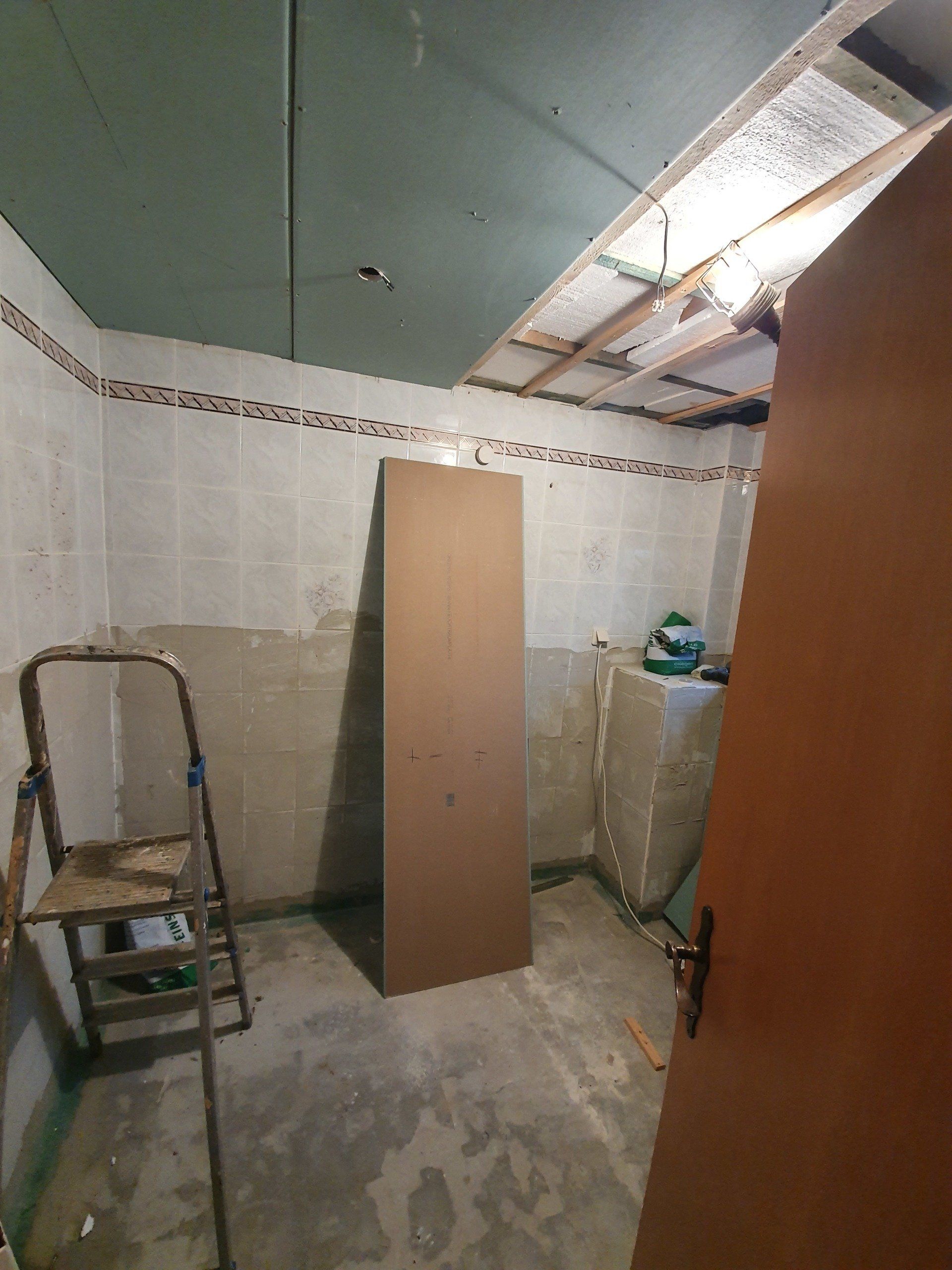 Für den Grundriss waren wir uns auch schnell einig: Bidet weg, begehbare Dusche hin, neue Toilette und neues Waschbecken, fertig. Weil ich der Meinung war, ich möchte alles komplett neu und schön haben, rissen wir auch noch spontan die Holzdecke raus.