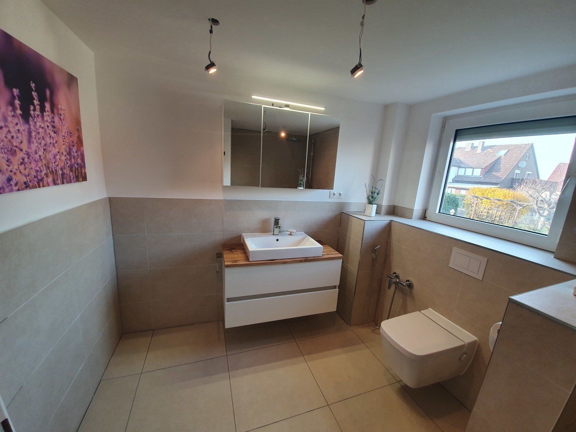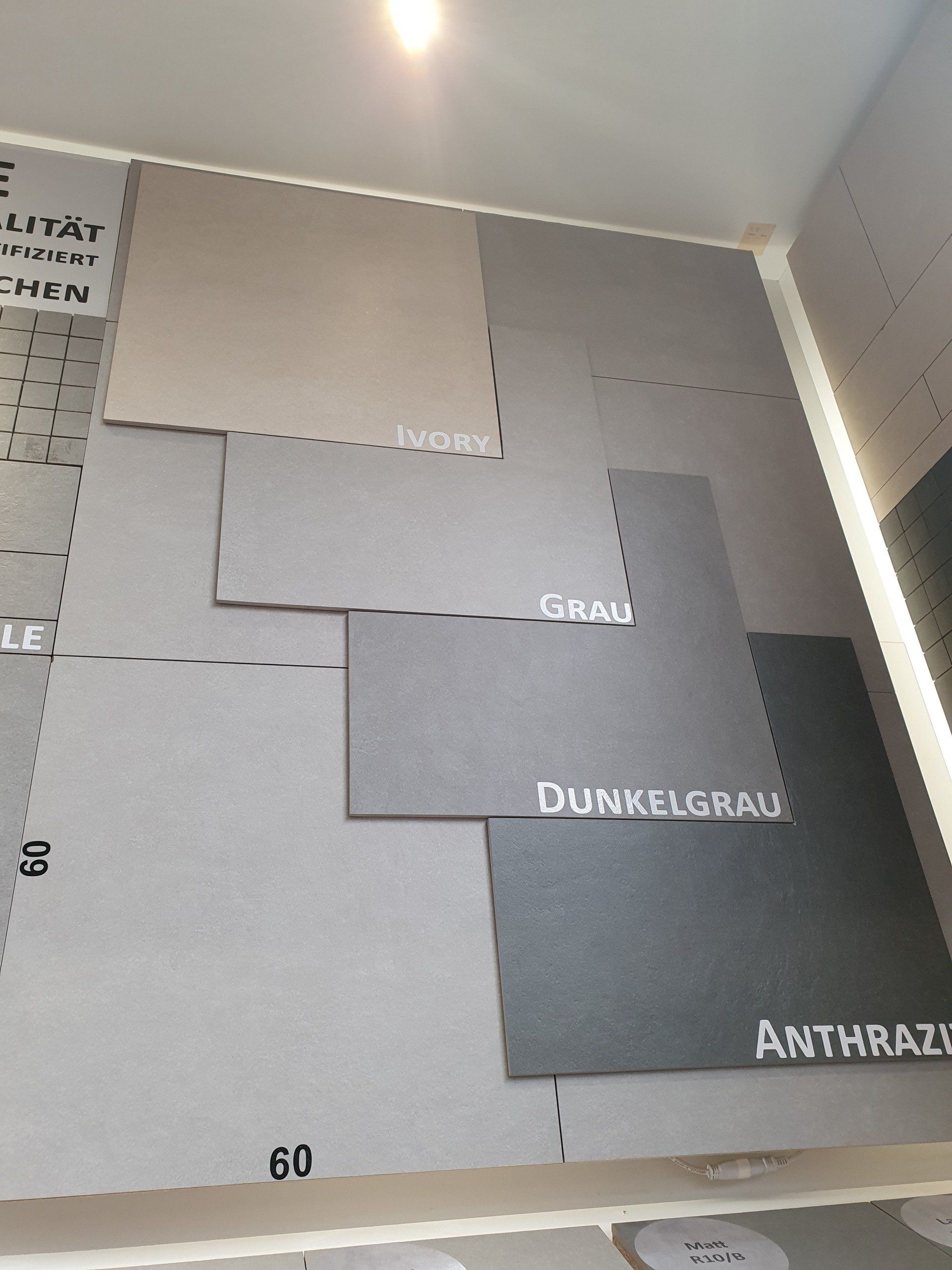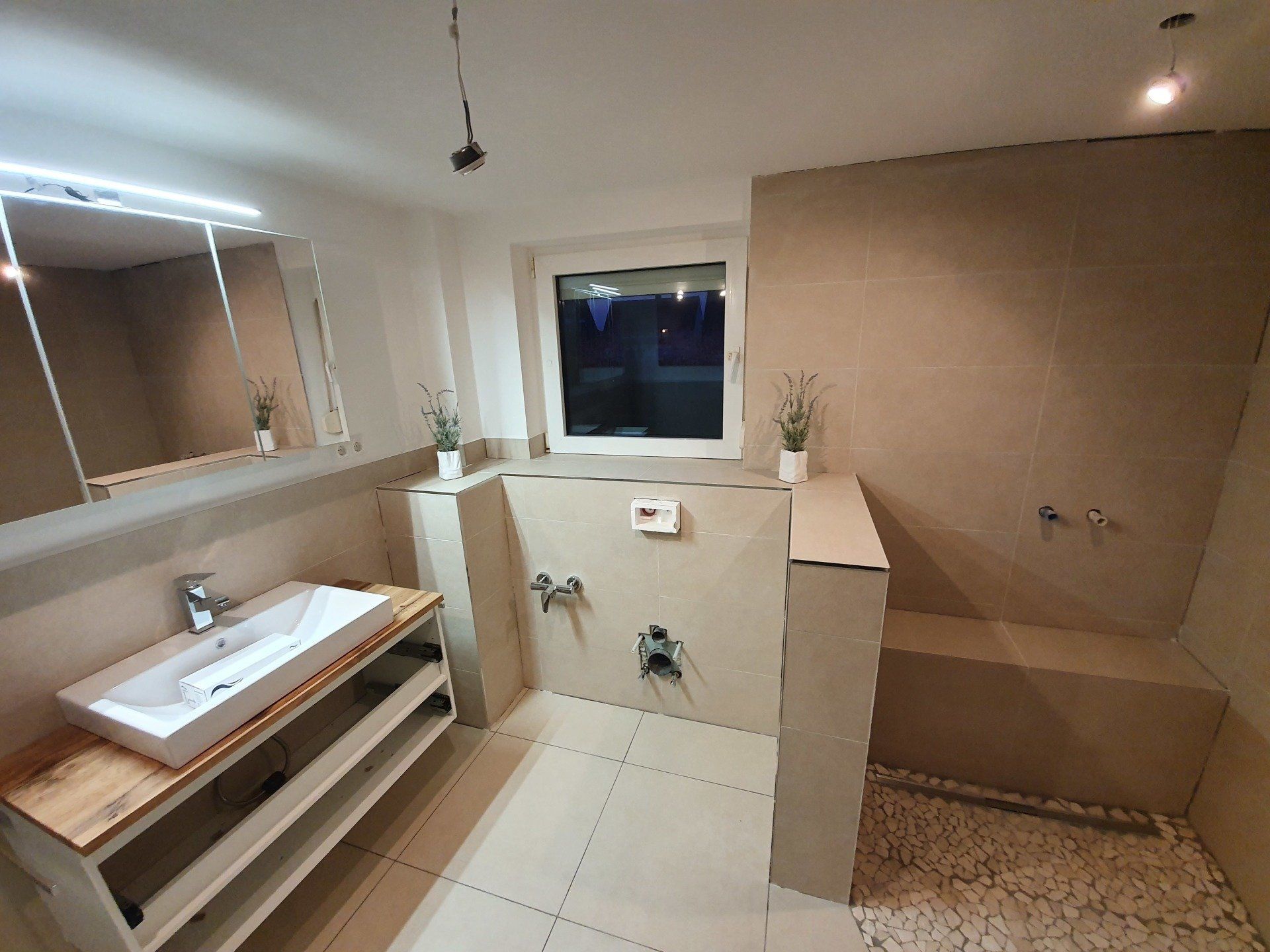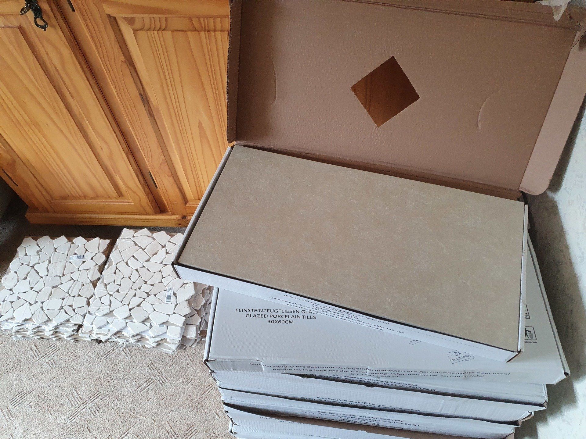 Nun ging es jedoch an die Design Frage. Welche Fliesen? Welche Größe? Welche Farbe? Welcher Stil? Natürlich durchforstete ich Pinterest und erinnerte mich an ein Bild, welches mich farblich schon einmal begeistert hat und zwar waren das Creme- und Sandtöne in Verbindung mit lila Dekoration. Die Auswahl der Fliesen fiel letztendlich dann tatsächlich nicht schwierig, da wir sogenannte R10 Fliesen brauchten, damit die Krankenkasse ihre Zuschüsse gibt. Und besonders rutschfeste Fliesen können ja nicht schaden. Gut, am Ende sind es dann die wohl teuersten Fliesen im ganzen Baumarkt geworden aber zur Auswahl an R10 Fliesen gab es 4 und in meinen gewünschten Farben tatsächlich nur diese einen, die mir gefielen. Dann kam natürlich die Lieferzeit, denn für den Boden wollte ich unbedingt 60x60 Fliesen, da ich die super schön finde, die man allerdings auch bestellen musste. Lieferzeit 2 Wochen. Ohje, ganz schön knapp aber gut, das wird schon! Alle restlichen Fliesen haben wir zurücklegen lassen bzw. reserviert, damit wir sie mit einem größeren Auto abholen konnten. Für die begehbare Dusche haben wir uns für ein Mosaik entschieden, auf Empfehlung des Fliesenlegers und es war die absolut richtige Entscheidung. Nach dem Kauf war ich mehr als glücklich. Soltan konnte in der Zeit noch wenig Begeisterung ausüben, er ließ mich eben machen, da er mittlerweile genau weiß, es dauert bei mir nicht lange und ich habe eine direkte Vorstellung davon, wie es einmal werden soll.