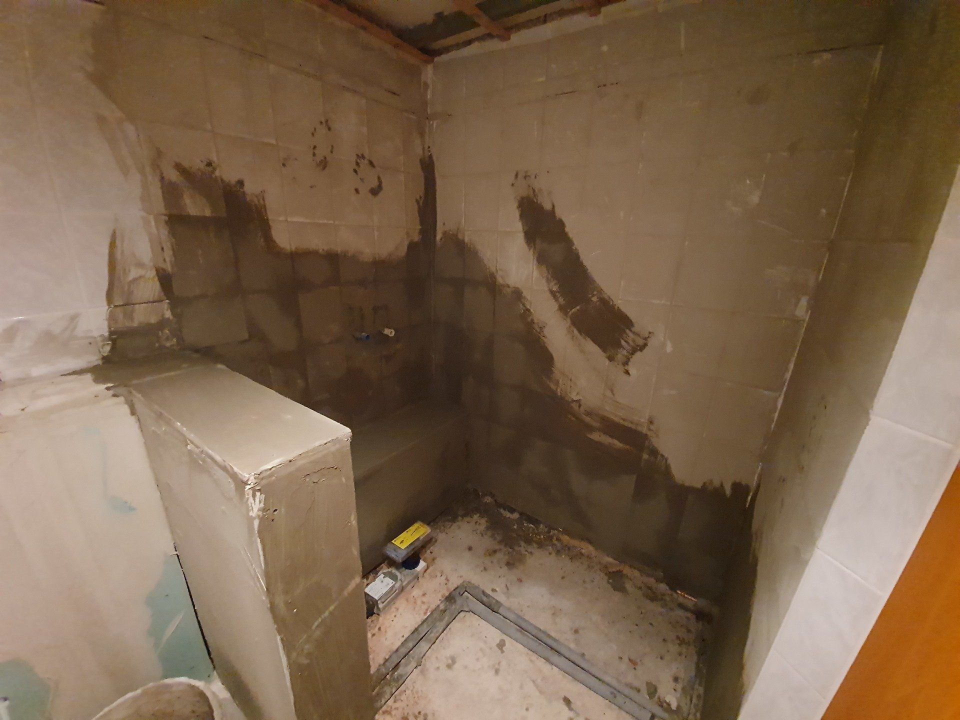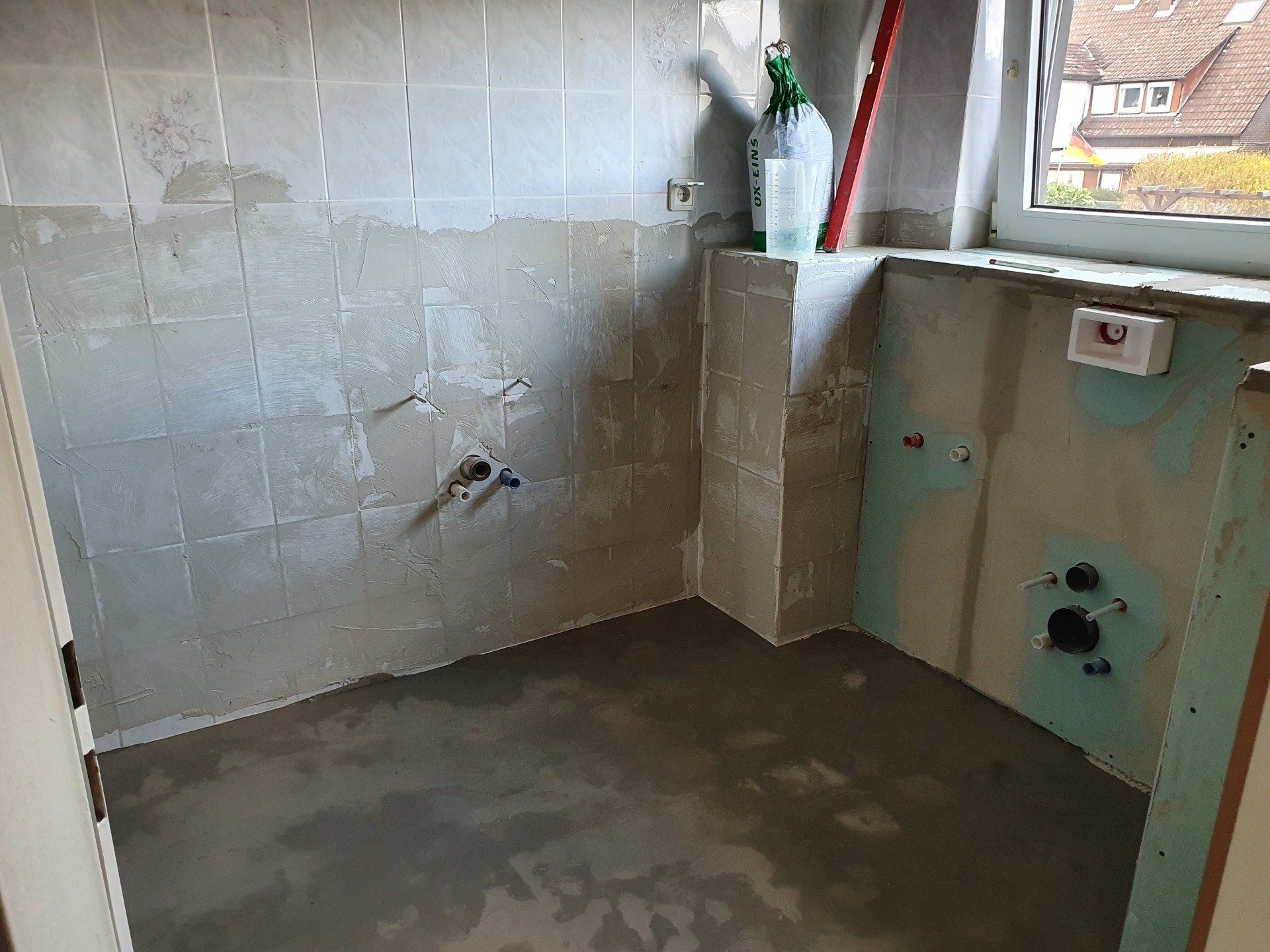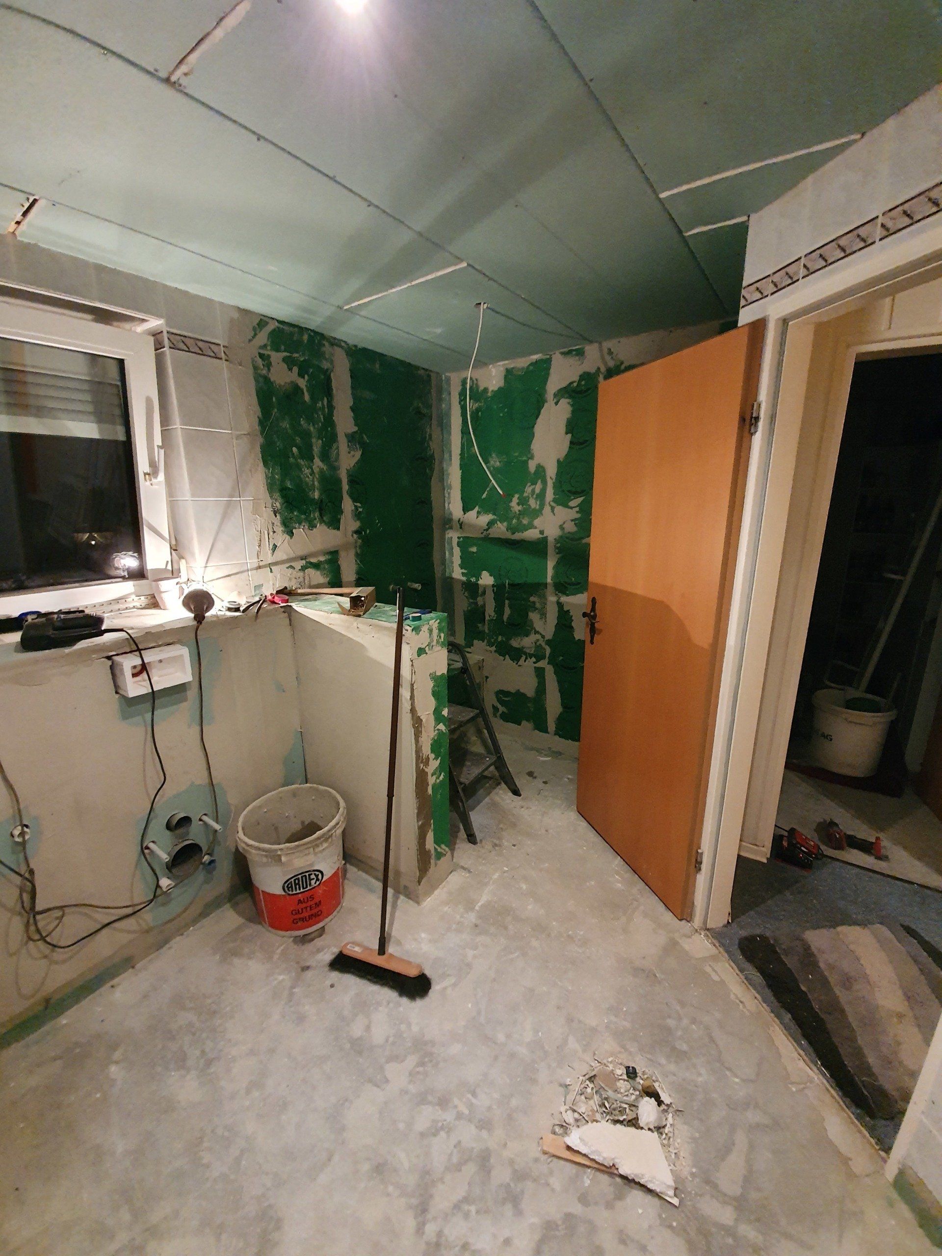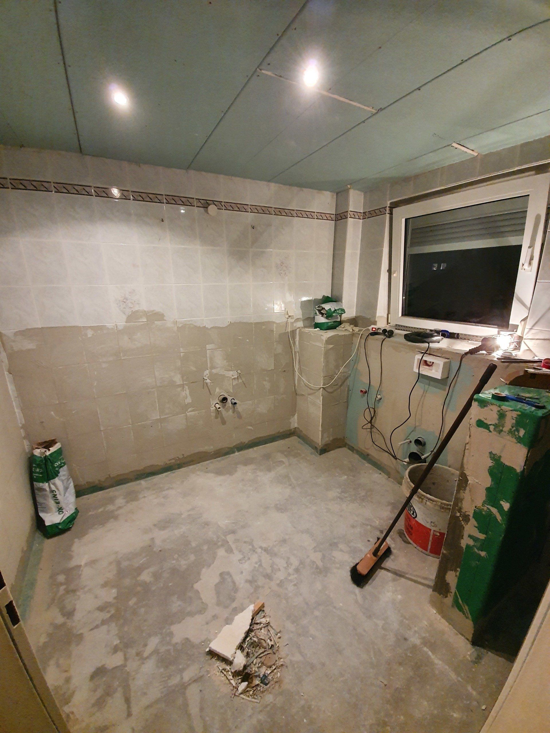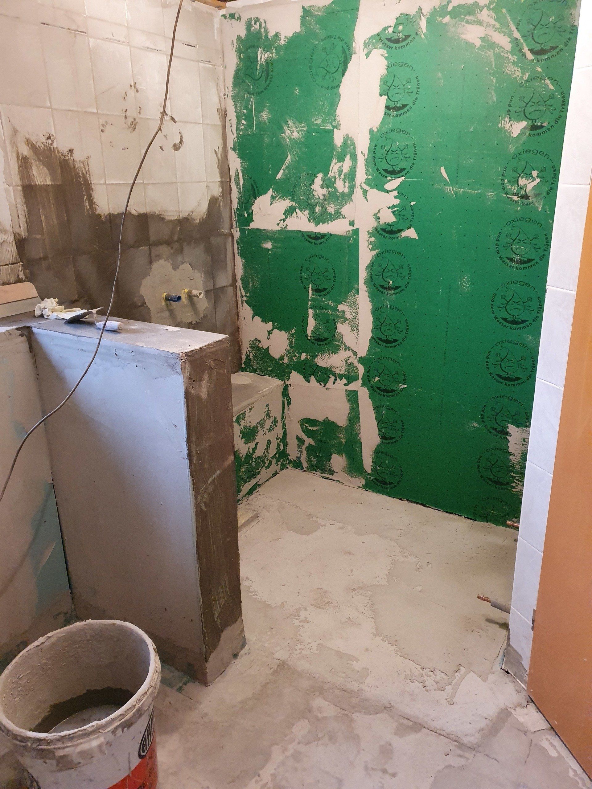 Doch es musste weitergehen. Der Sockel über der Toilette und damit gleichzeitig die Trennwand zur Dusche wurde fertig gebaut, die Bodenfliesen wurden raus gerissen und der ganze Boden mit Estrich-Beton ausgegossen. Die Wandfliesen sollten außerhalb der Dusche an der Wand bleiben, da wir das Badezimmer im modernen Stil nur halbhoch fliesen würden.