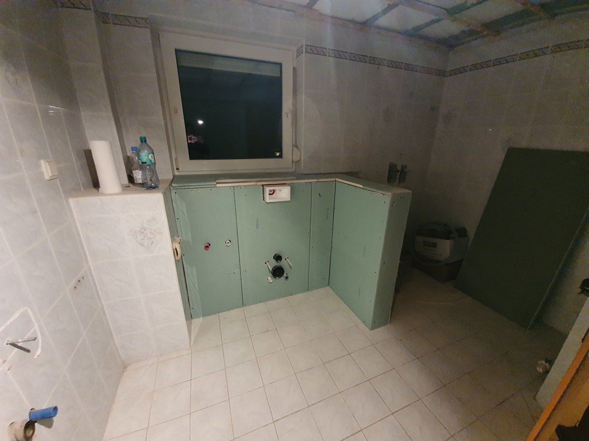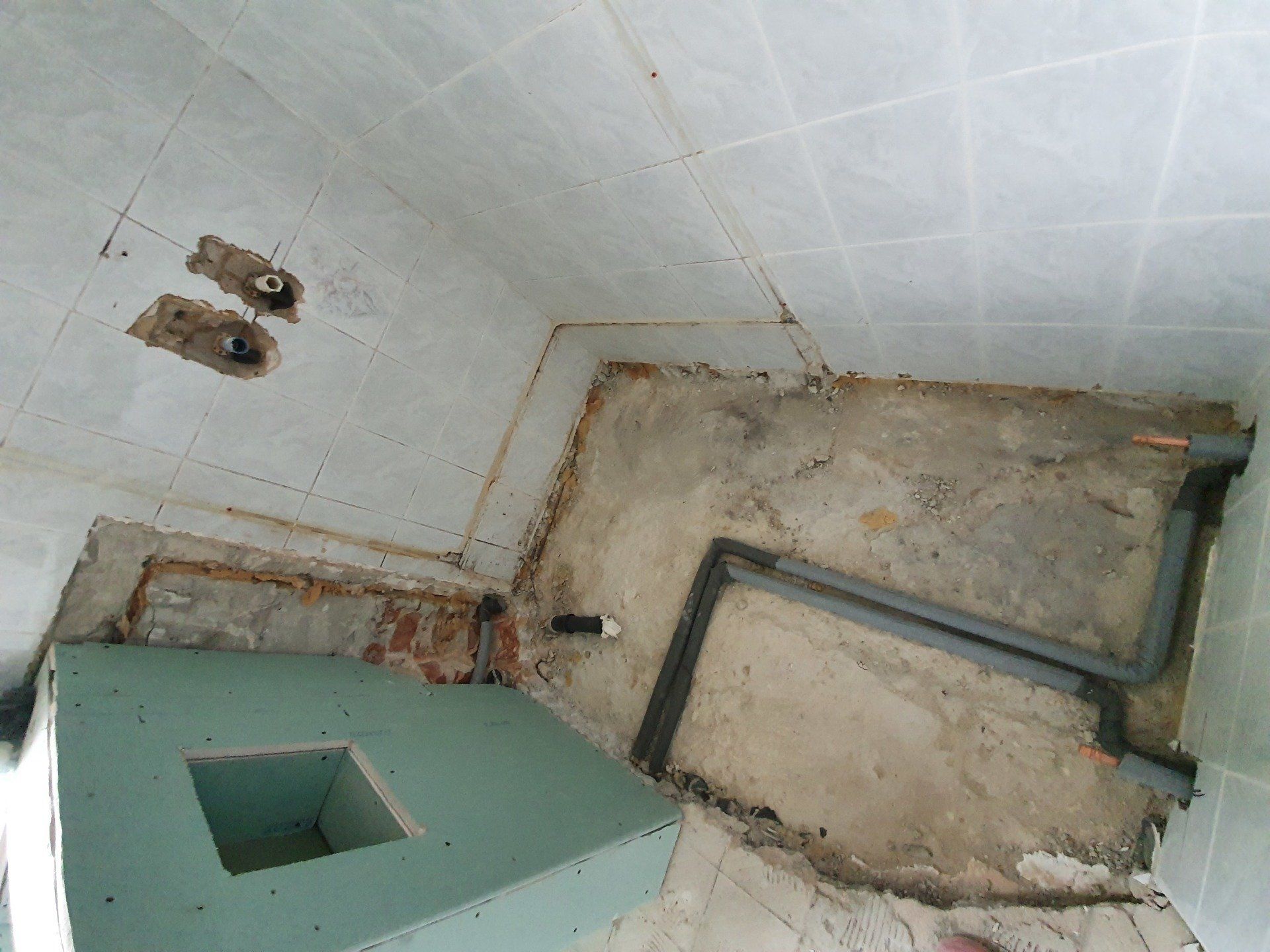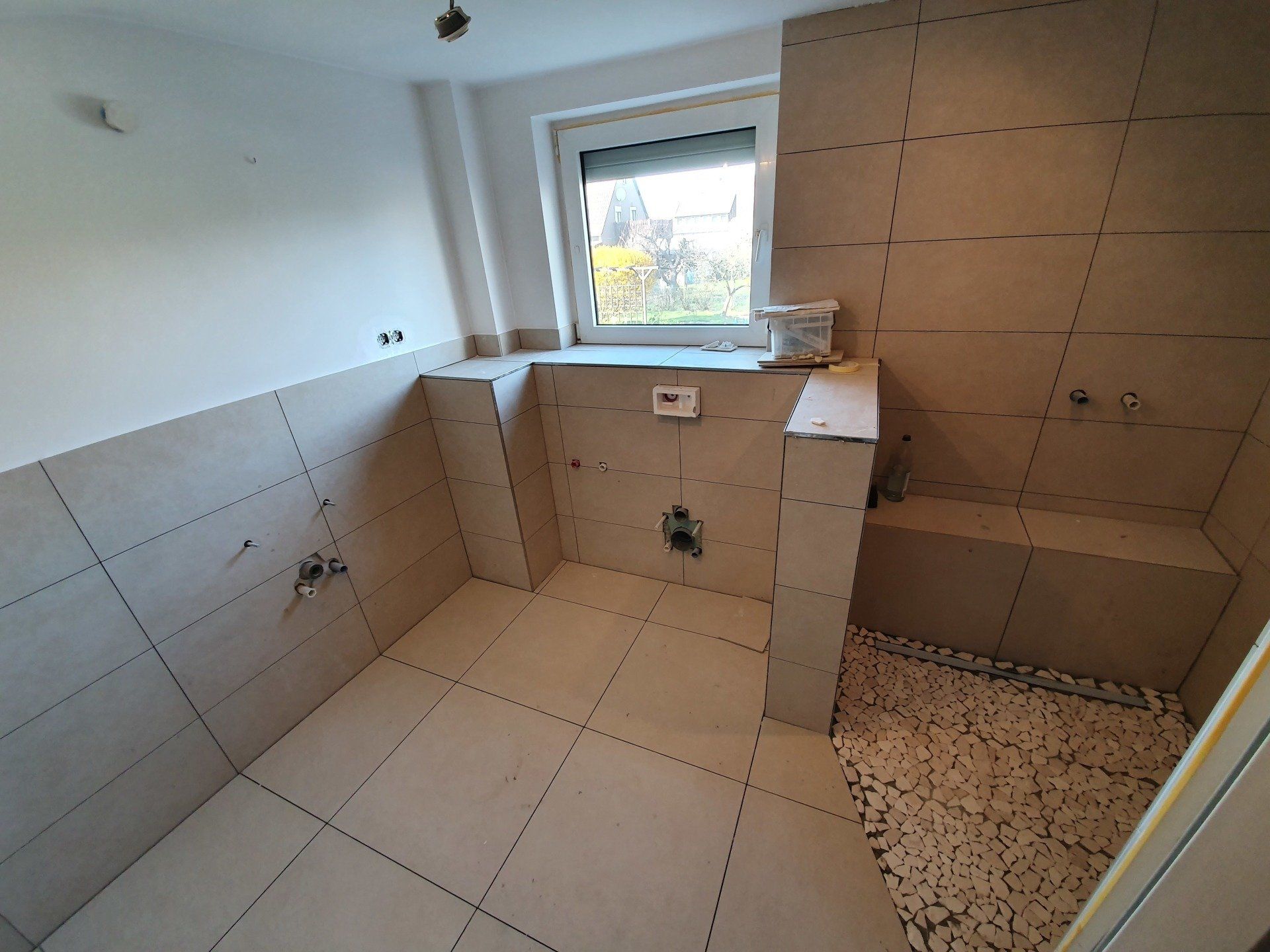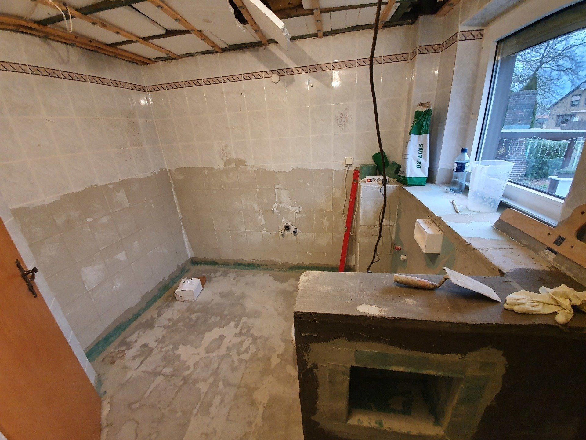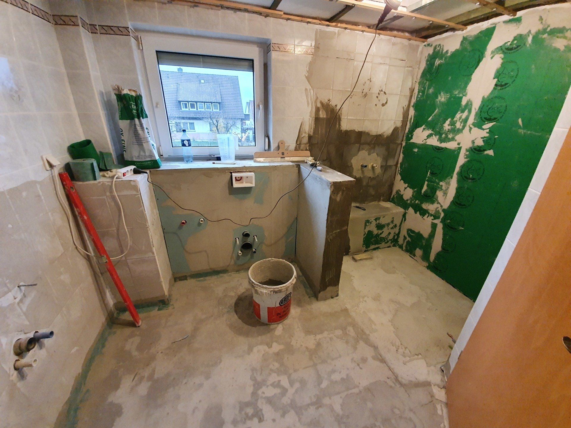 Doch es musste weitergehen. Der Sockel über der Toilette und damit gleichzeitig die Trennwand zur Dusche wurde fertig gebaut, die Bodenfliesen wurden raus gerissen und der ganze Boden mit Estrich-Beton ausgegossen. Die Wandfliesen sollten außerhalb der Dusche an der Wand bleiben, da wir das Badezimmer im modernen Stil nur halbhoch fliesen würden.