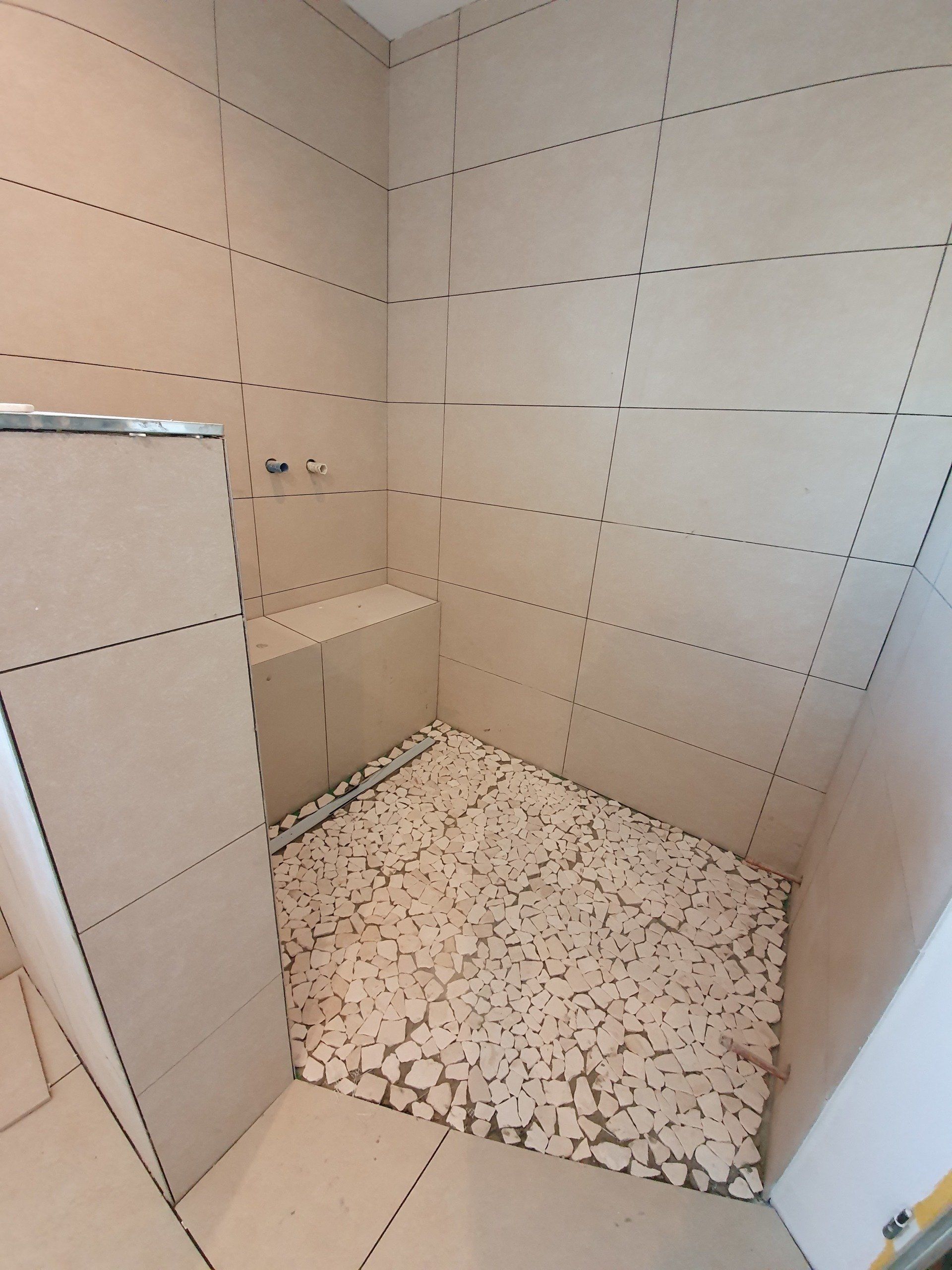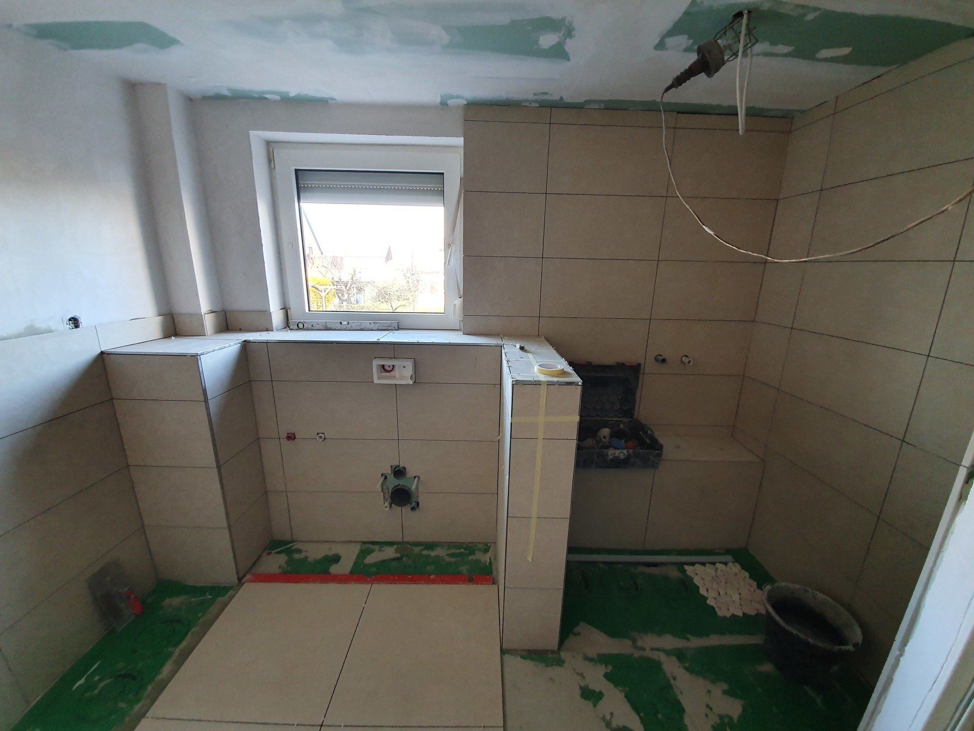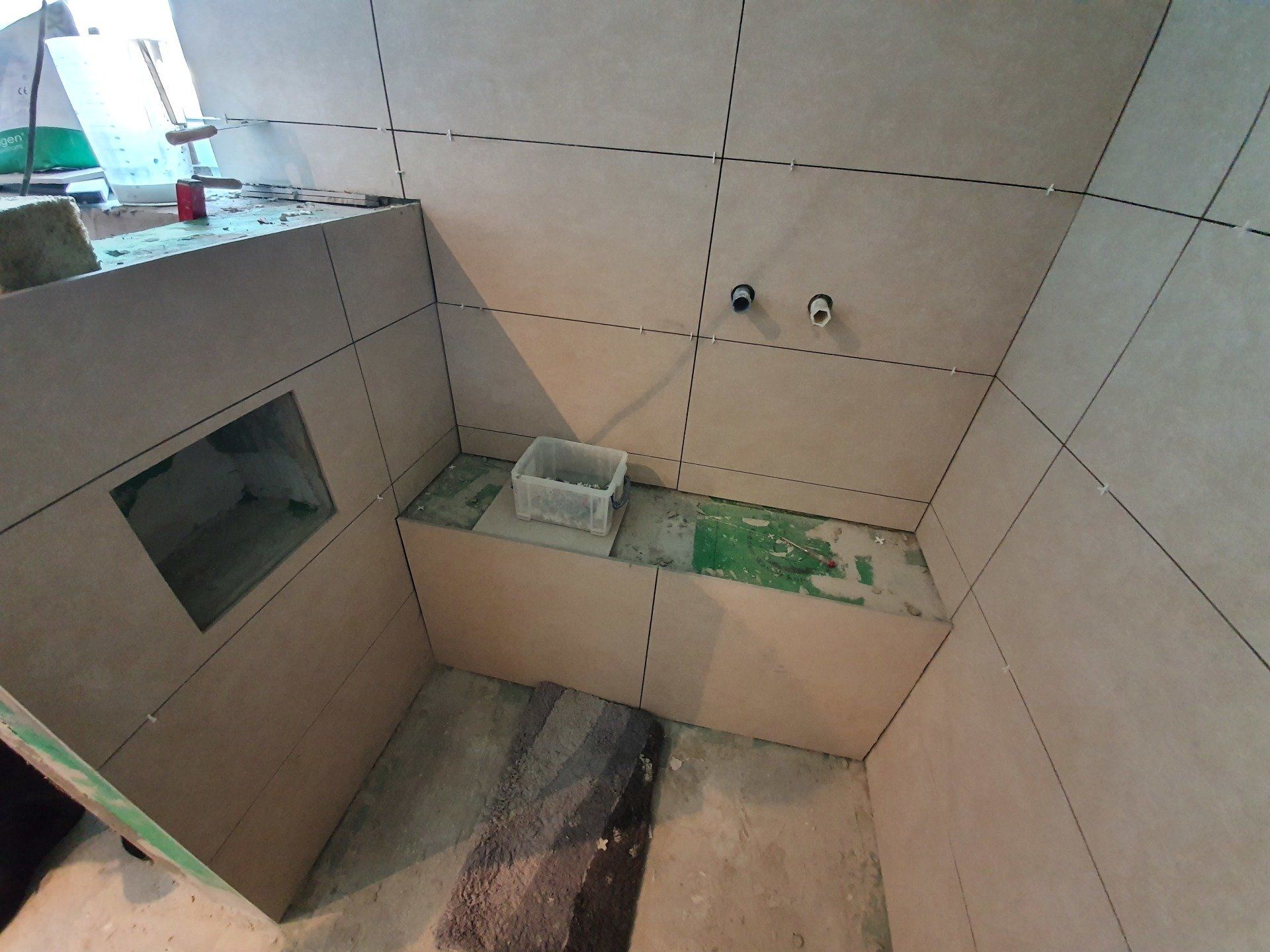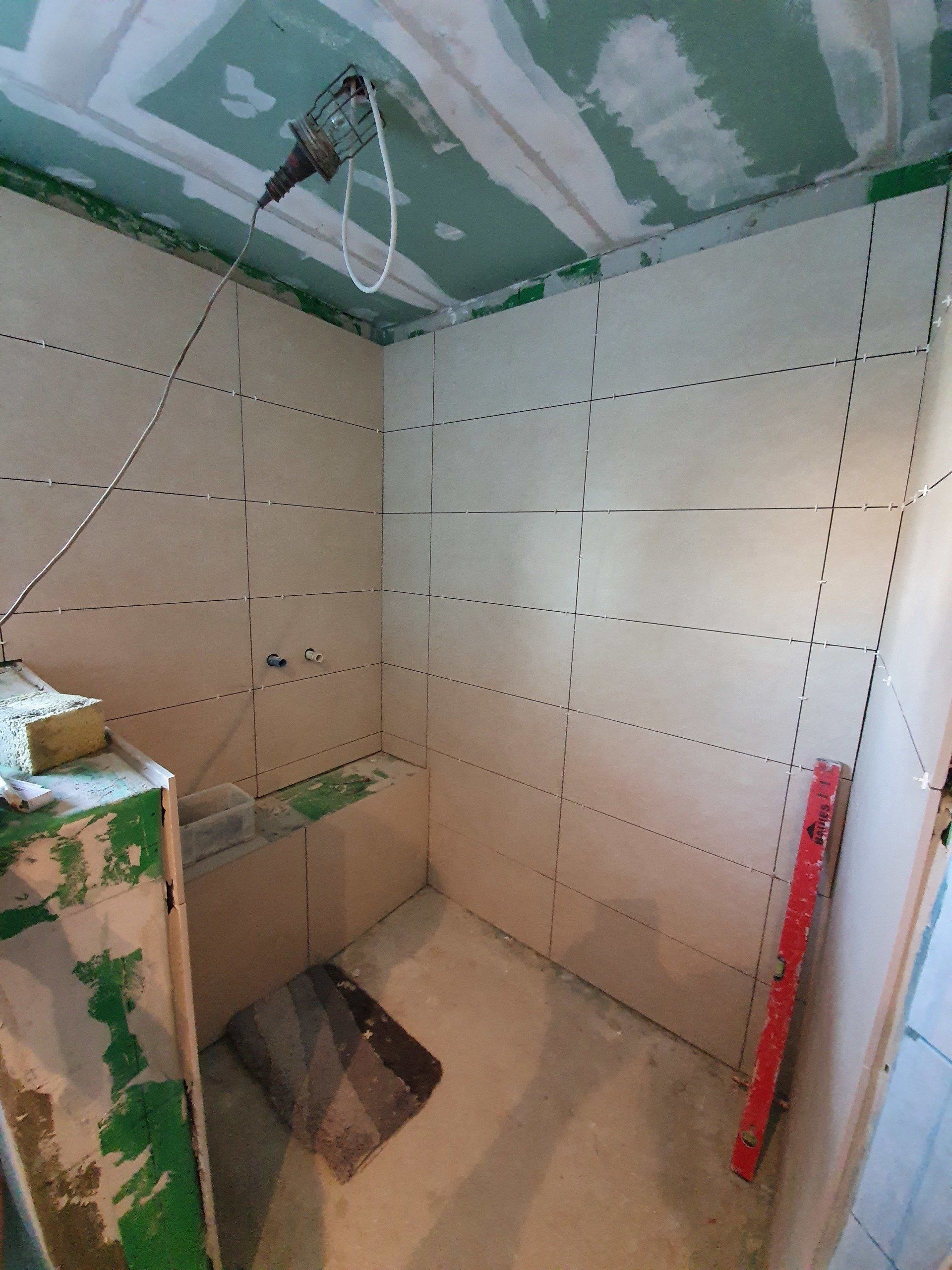 Der nächste Schritt war dann die Arbeit des Fliesenlegers, der alles abdichtete und die Sitzbank in der Dusche mauerte, da wir alle der Meinung waren, es wäre definitiv die beste Variante für sie. Da sollte ich mich dann auch entscheiden ob Eckbank oder an der Seite oder wie oder was und entschied mich dafür, sie direkt unter der Dusche zu machen mit einer Dusch-Armatur, die etwas mehr zur Wand hin hängen würde, damit man direkt daneben sitzen kann.