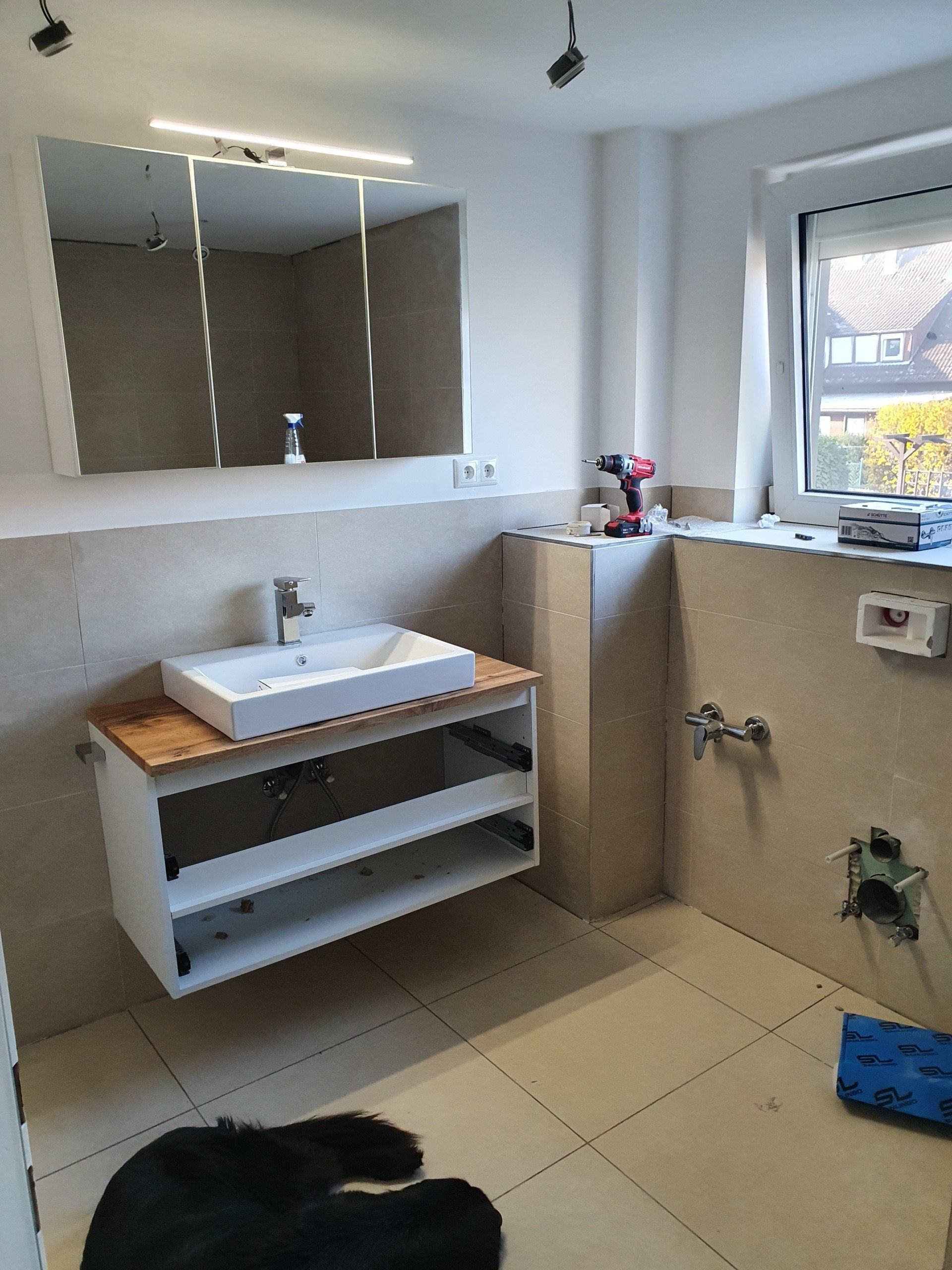 Aber Vorsicht, wenn ihr jetzt denkt, das wäre alles ja wunderbar und easy gelaufen, nene, es war so eine richtige Baustelle mit allem drum und dran. Das erste hat länger gedauert als das andere, dann hat sich das andere verzögert usw. Und dann findet mal einen Waschtisch, der weniger als 3 Wochen Lieferzeit hat, fast unmöglich! Und da muss ich sagen, hatte ich echt Entscheidungsprobleme. Es sollte nicht das Billigste sein aber auch keiner dieser Waschtische über 1,000€ und 1,000€ ist bei Waschtischen ja gewiss nicht viel. Am Ende haben wir ein Set aus Waschtisch, Waschbecken und Spiegelschrank für 800€ gefunden und bestellt. Lieferzeit sollte 5-7 Werktage betragen. Wenige Stunden nach Kauf dann die Nachricht: Es wird voraussichtlich in 2 Wochen geliefert. Um Gottes Willen! Was für ein blöder Plan, ein Badezimmer in nur 3 Wochen zu sanieren!