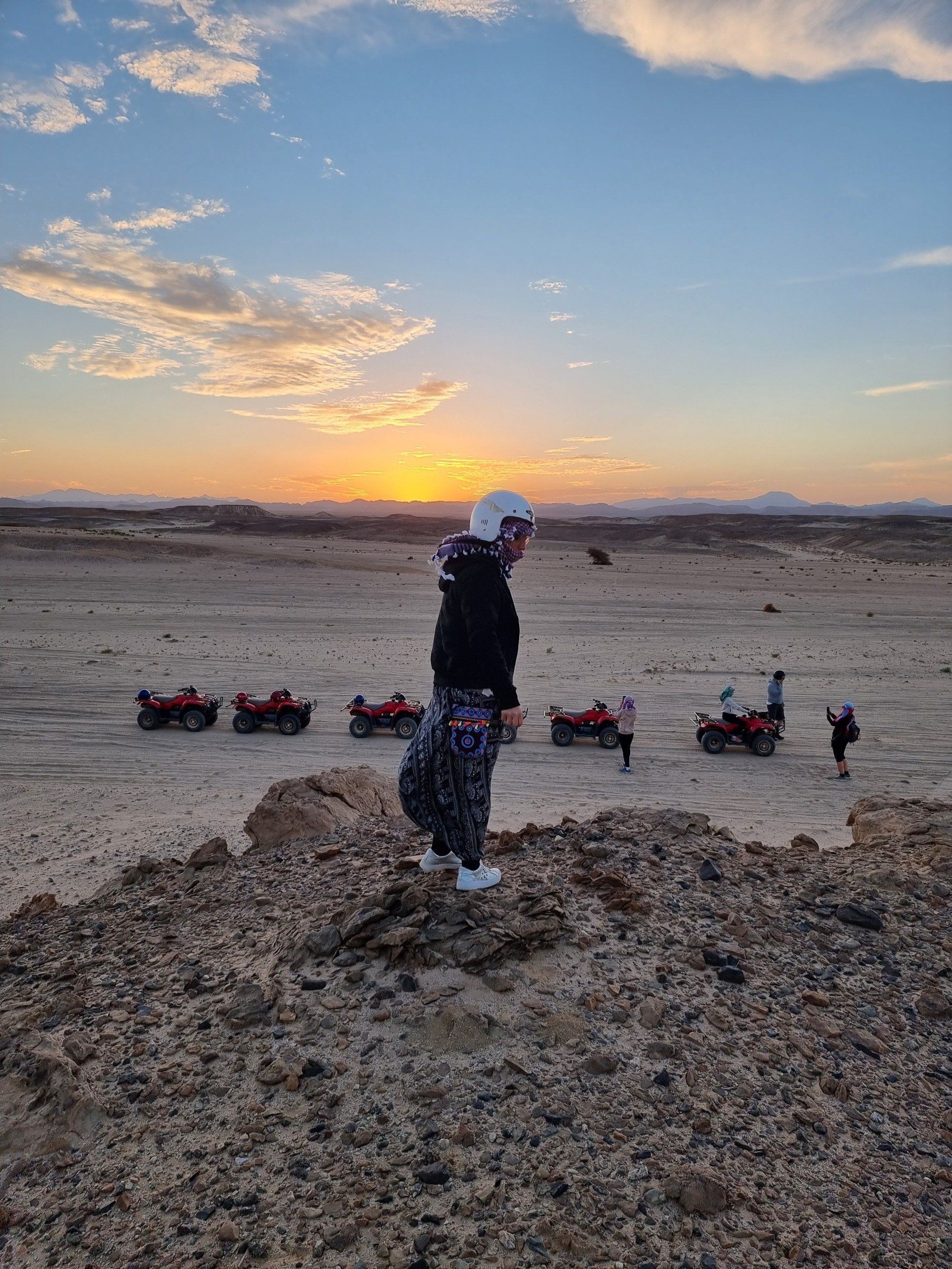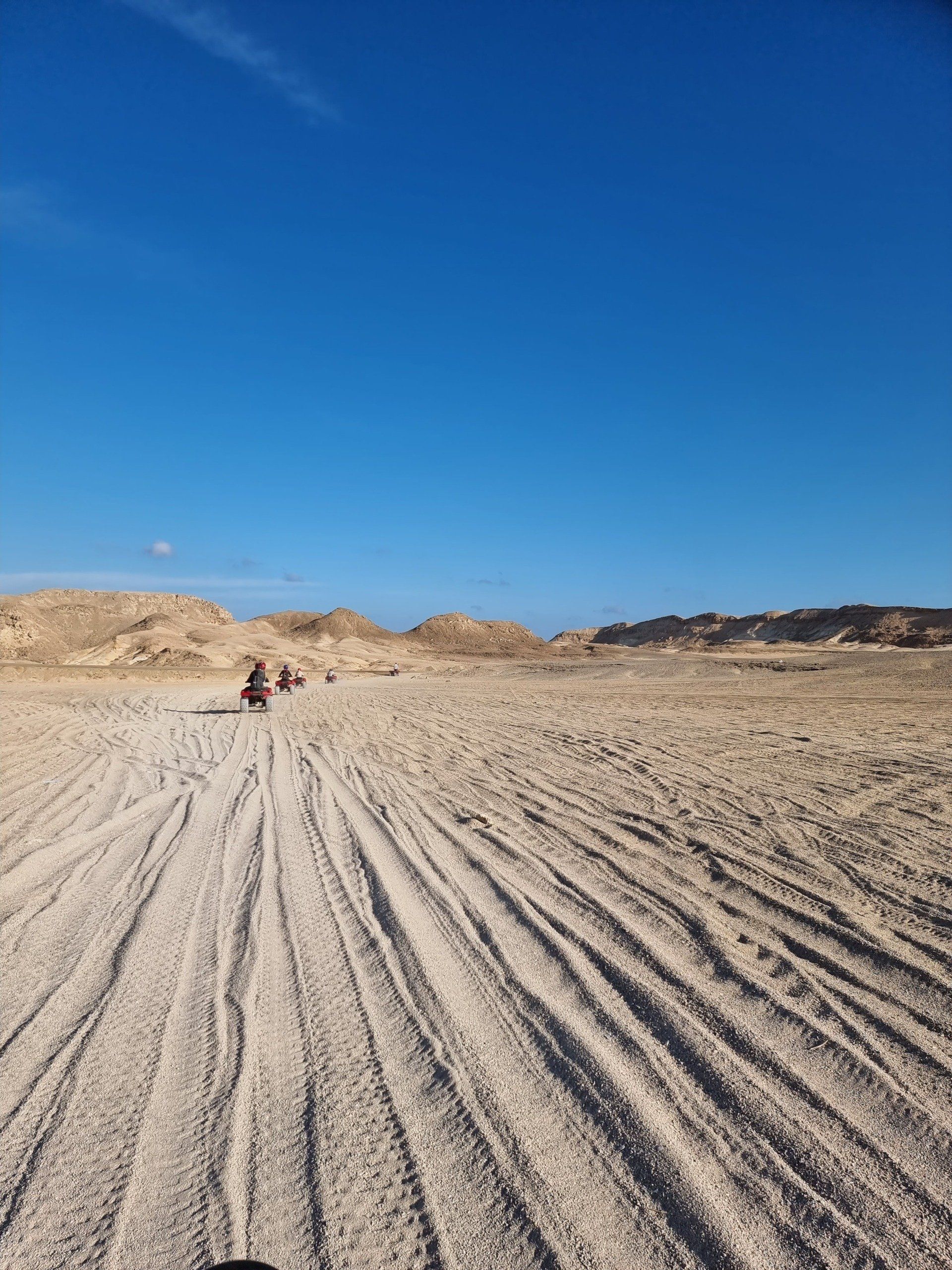 Zum ersten Mal haben wir in diesem Urlaub an einer Quadtour teilgenommen. Ich hatte das mit Soltan schon mal in Hurghada gemacht und da fand ich es echt blöd, weil mir der ganze Arm nach unserer Offroad-Tour so wehtat aber die Tour vom Hotel aus war einfach nur wunderschön. Wie sehr liebe ich die Wüste, hach, da könnte ich immer wieder von Schwärmen. Raus aus unserem Hotel, über die Straße und yallah in die Wüste! Ich saß hinter Soltan und blickte in die Ferne. Das hier fühlt sich "Zuhause" an. Der Sand, die Sonne, diese unglaublich magische Umgebung. Jede Faser meines Körpers schrie danach, mein Herz pochte wie wild und bem Gedanken daran, dass der Heimflug schon wieder vor der Tür stand, wurde mir ganz übel.